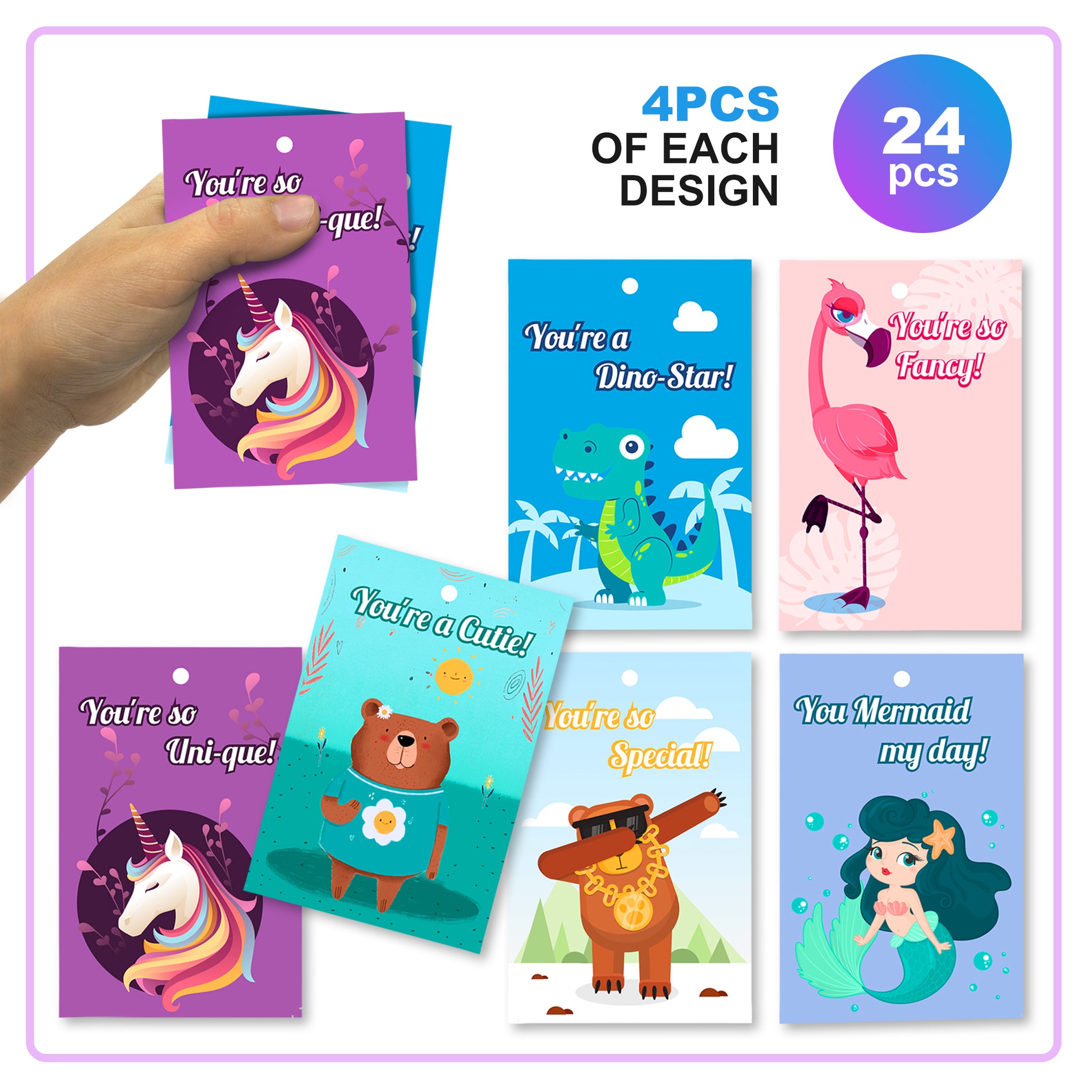 - GREAT VALUE GIFT SET. 24 PACK Valentine party favors includes 6 different designs of Valentine Sequin Keychains and Valentine's Day Cards, 4pcs of each. Total 24 gift sets which is perfect for any class give away