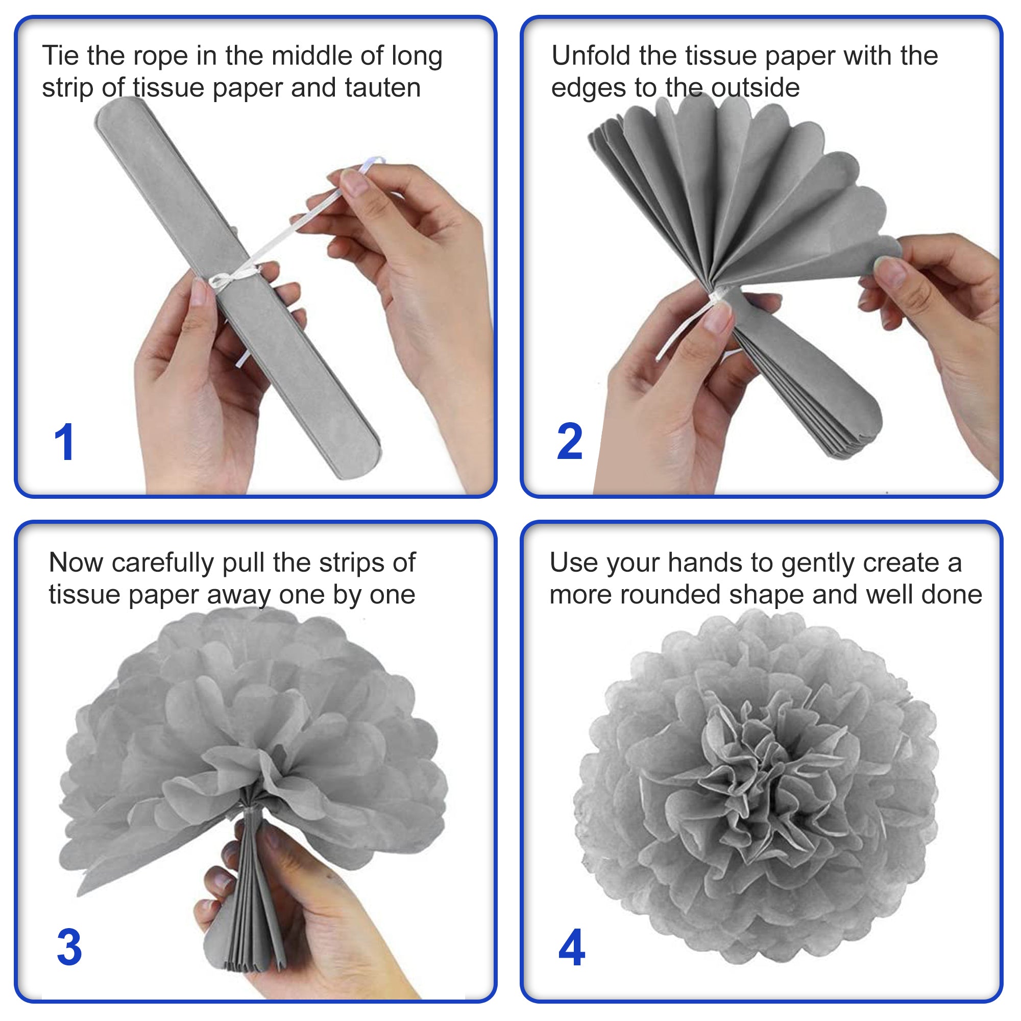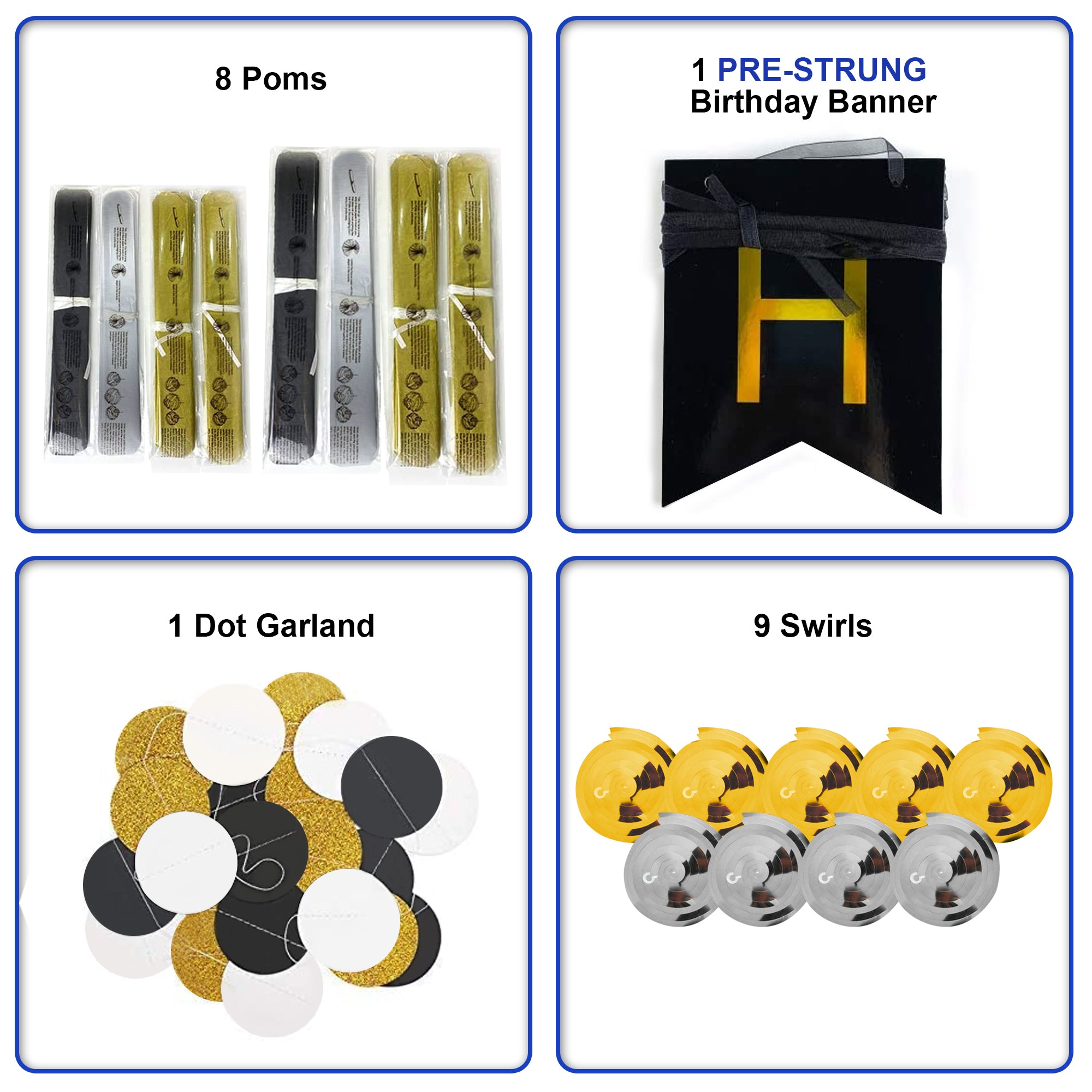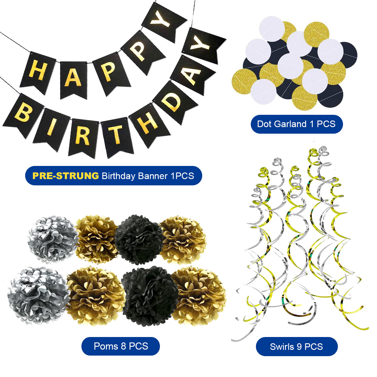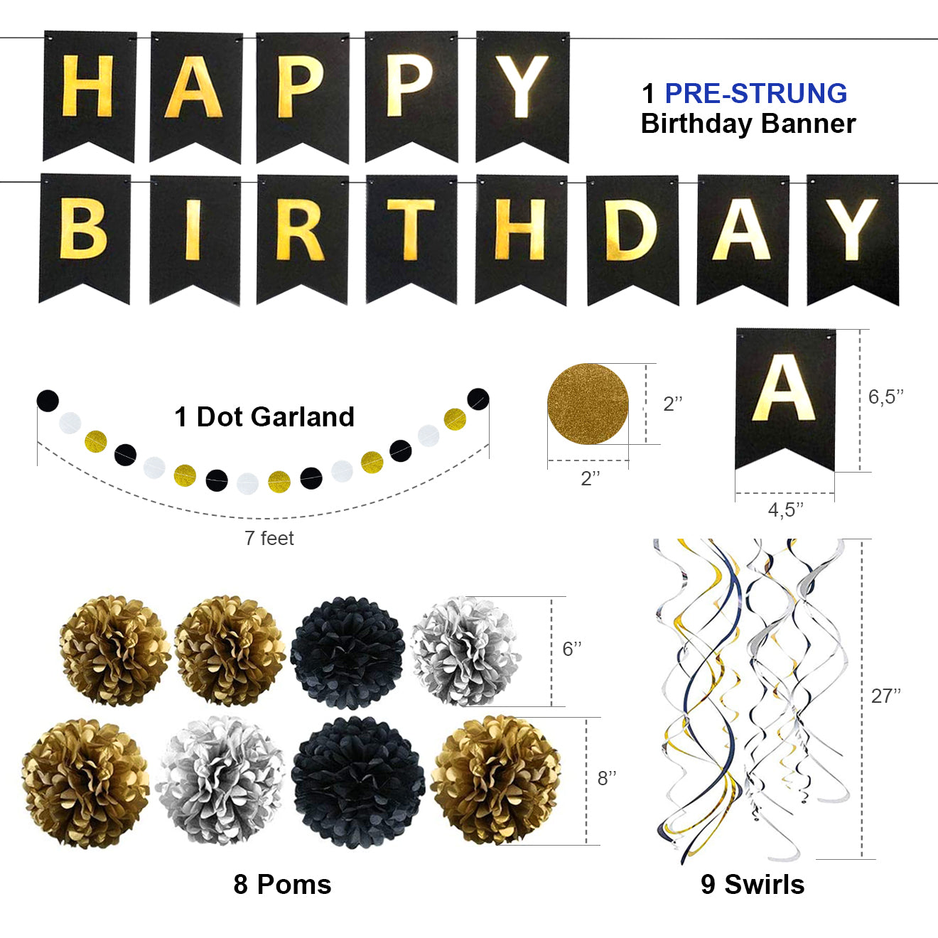 - Our set of black and gold party decorations features a pre-strung black happy birthday banner (each letter is 6.5" x 4.5"), 8 tissue pom poms flowers (8"&10"), one 7ft dots garland, and 9 colorful hanging swirls (each 27").