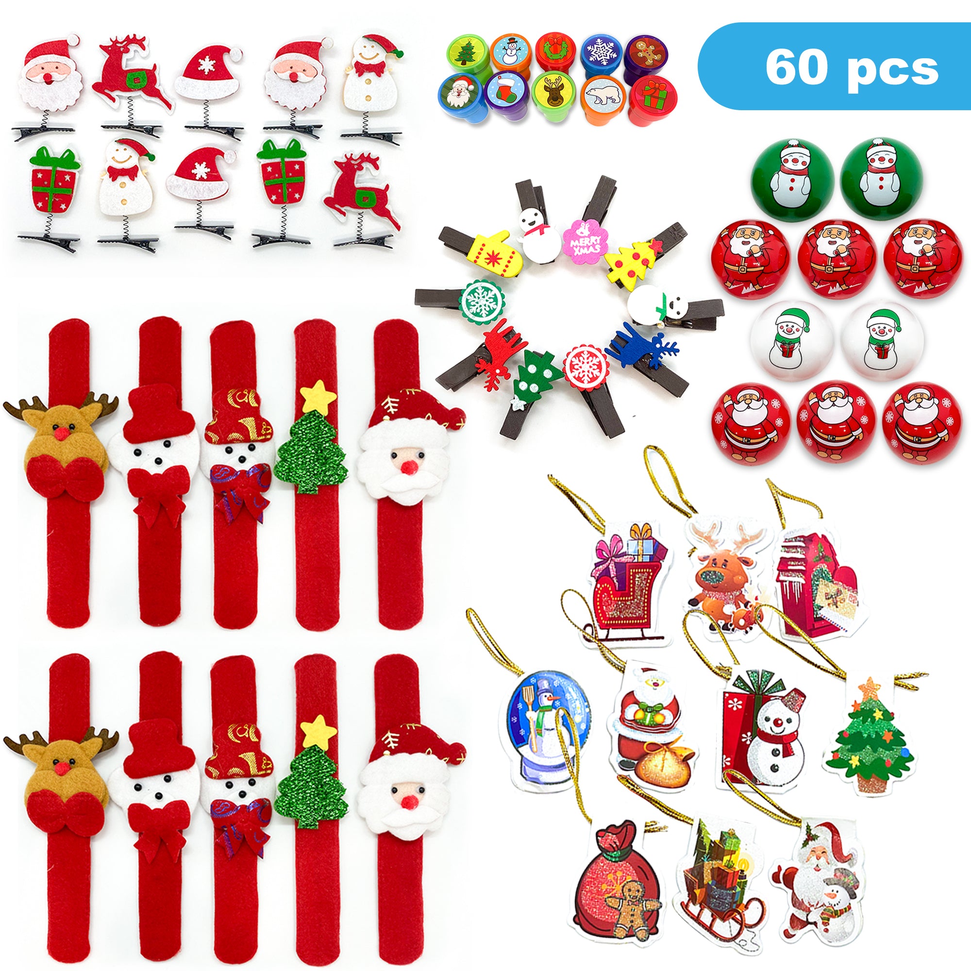 - ✅ VALUE CHRISTMAS PRIZE BOX: Our Christmas party favors for kids includes 6 kinds of assortment toys (60 pcs): Christmas theme felt clap bracelets, half round Christmas theme pull back cars, Christmas theme wooden clips, Christmas theme stamps, Christmas theme felt hair clips and Christmas theme hanging cards.