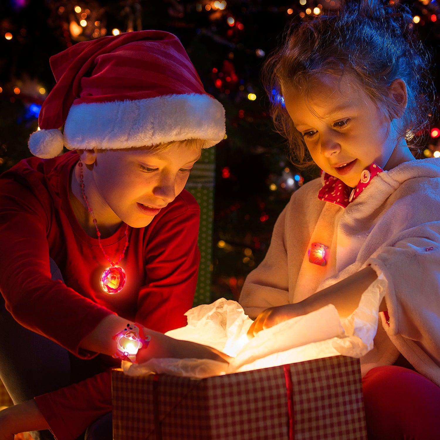 - ✅ VALUE CHRISTMAS PRIZE BOX: Our Christmas party favors for kids includes 6 kinds of assortment toys (55 pcs): Christmas theme bracelet with light, Christmas necklace with light, Christmas theme pins with light, Christmas theme rings with light, optical fibers Christmas tree and Christmas theme stickers.